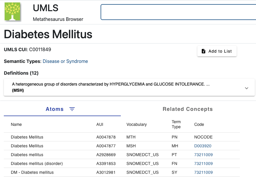 One can use the UMLS Browser to search for “Diabetes mellitus.” It will display a concept page similar to the one shown below.
